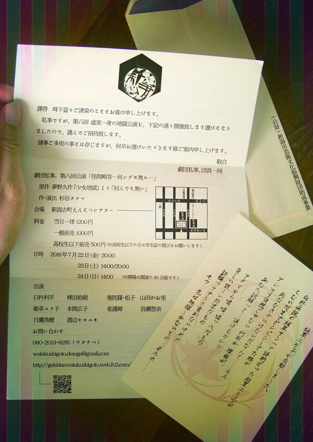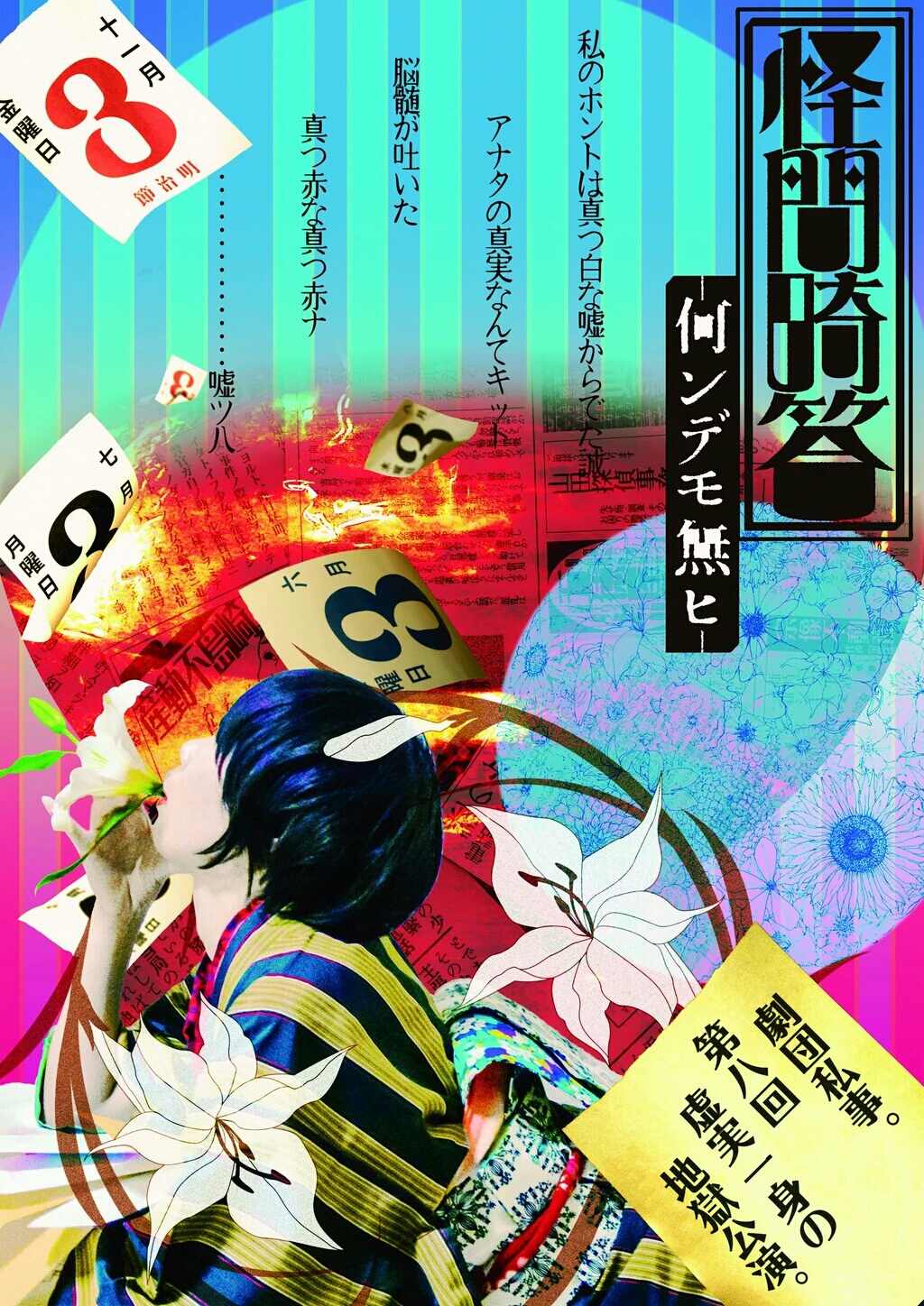 01 April 第八回公演 ◆第八回虚実一身の地獄公演「怪問畸答―何ンデモ無ヒ―」原作︙夢野久作『少女地獄』より「何んでも無い」作・演出:杉谷タクマ ○日時:2016年7月22日(金)20:0023日(土)14:00/20:0024日(日)14:00○料金:一般前売1000円高校生以下前売500円当日一律1200円(※高校生以下料金は要学生証)○会場:新潟古町えんとつシアター(https://goo.gl/maps/yQV8C1y23B52)○出演 臼杵利平 : 栁沼佑樹 姫草ユリ子 : 本間広子 白鷹秀麿 : 渡辺ヒロユキ 松子・曼陀羅 : 山田かお里 看護婦 : 岩瀬悠奈公演写真はコチラhttps://photos.app.goo.gl/IsXqs20xJrCqFH2X2 PR